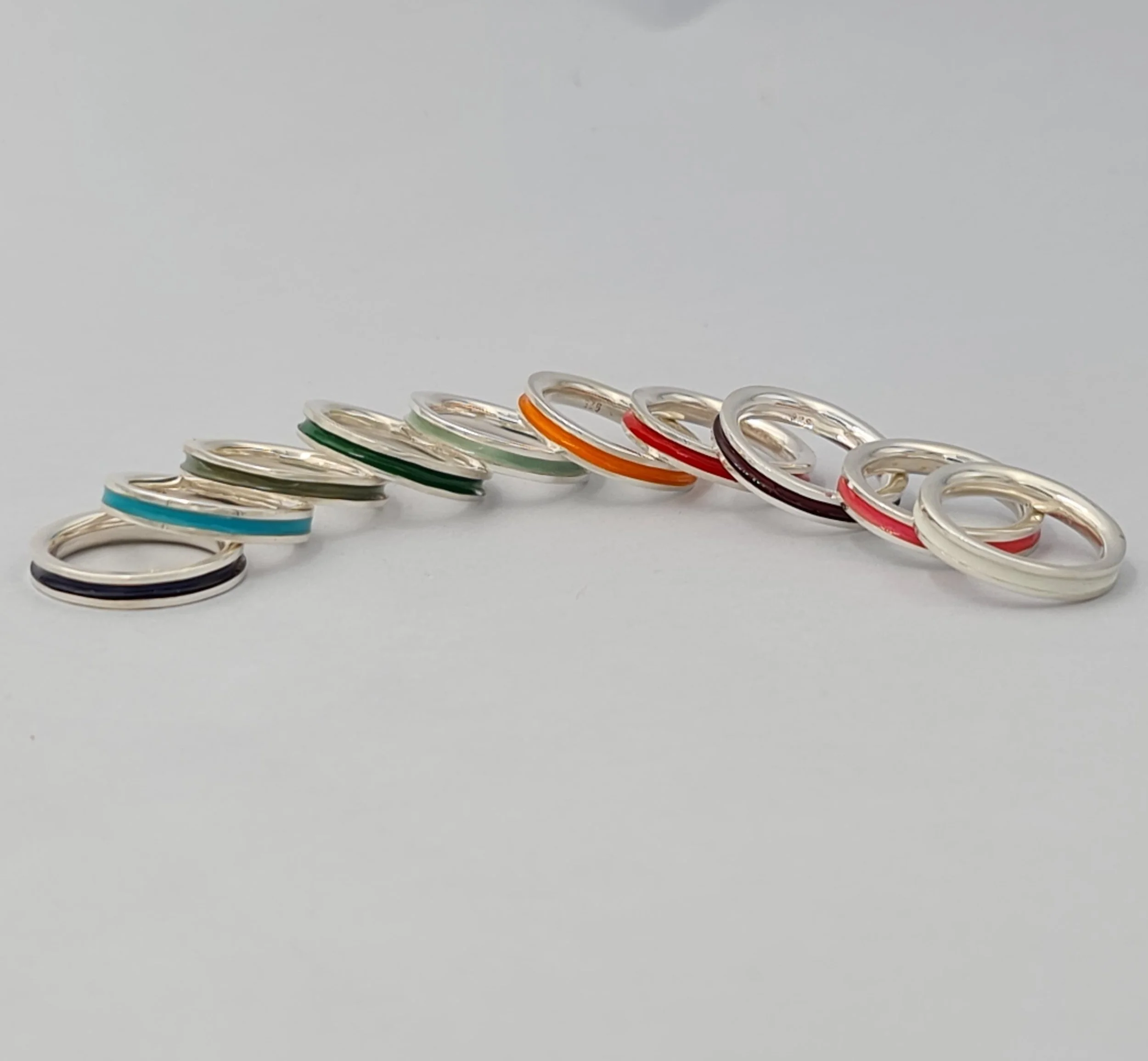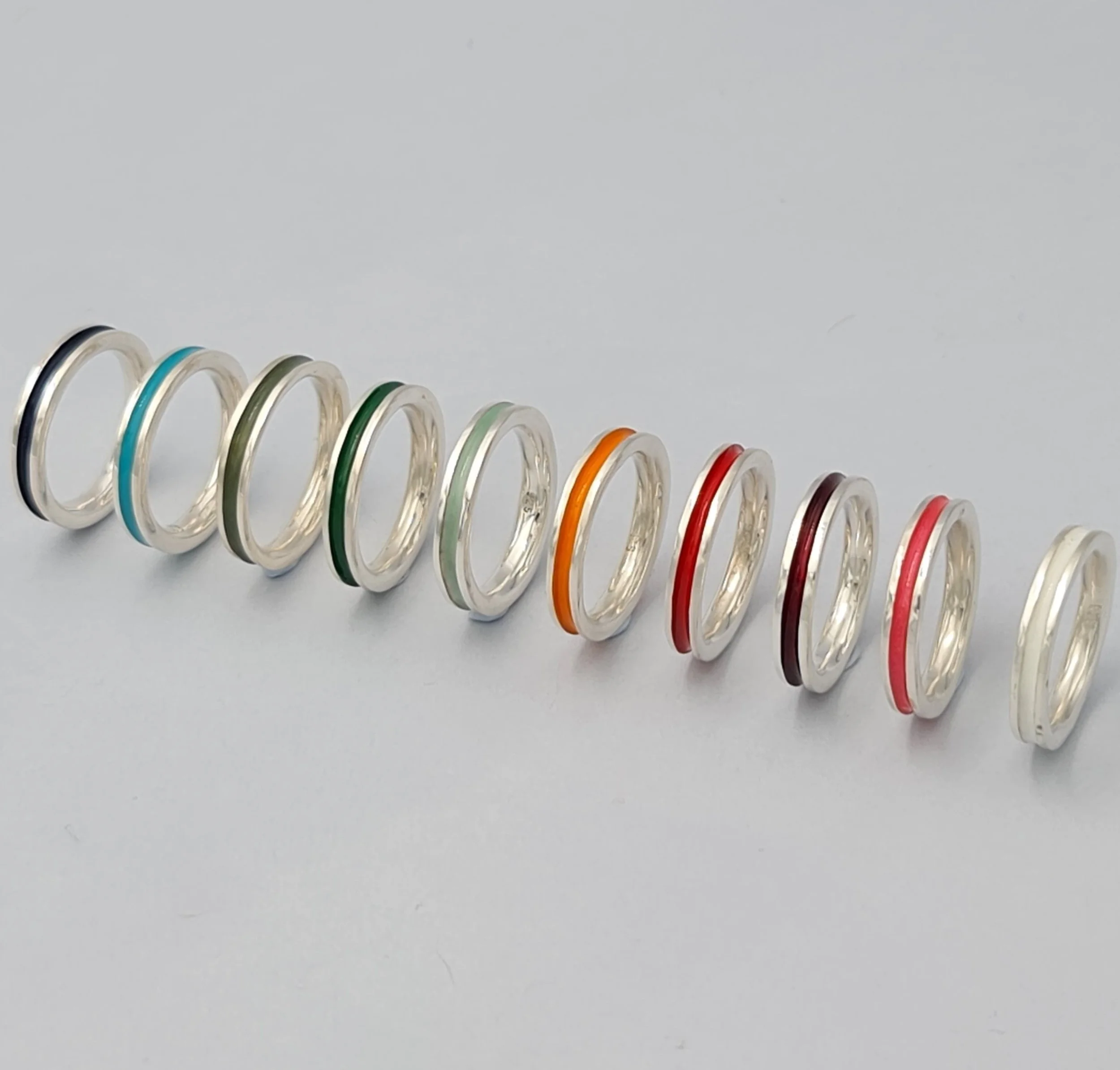 While nice on their own, these rings were designed as stacker rings. The rounded shape makes them very comfortable to wear and you can mix colours to match your wardrobe…